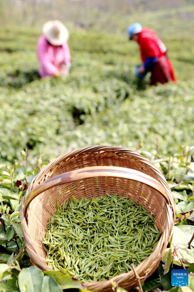 Workers harvest tea leaves in Baicha Village of Tuanba Town in Dazhu County, Dazhou, southwest China's Sichuan Province, March 28, 2023. Recently, workers are busy in harvesting and processing tea leaves ahead of the Qingming Festival to produce the Mingqian (literally "pre-Qingming") tea, which are made of the very first tea sprouts in spring and considered to be of high quality. (Xinhua/Deng Liangkui)