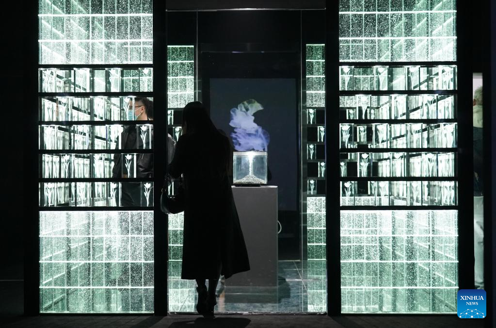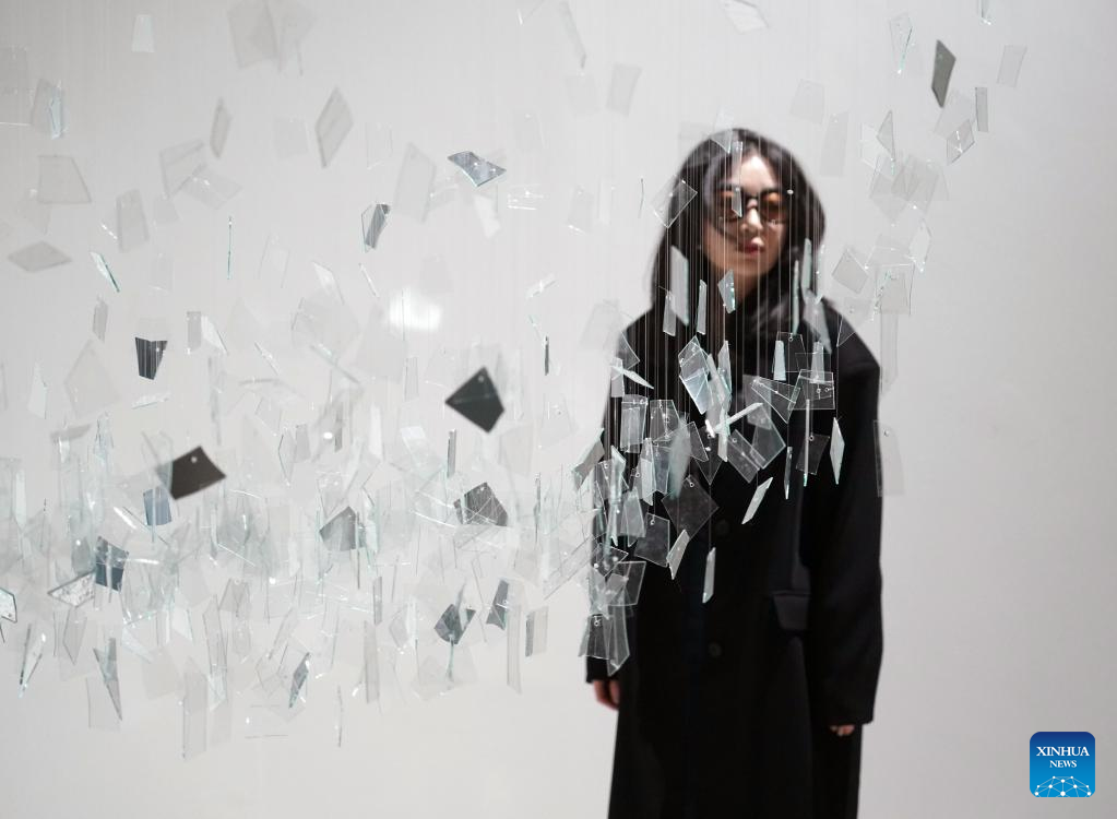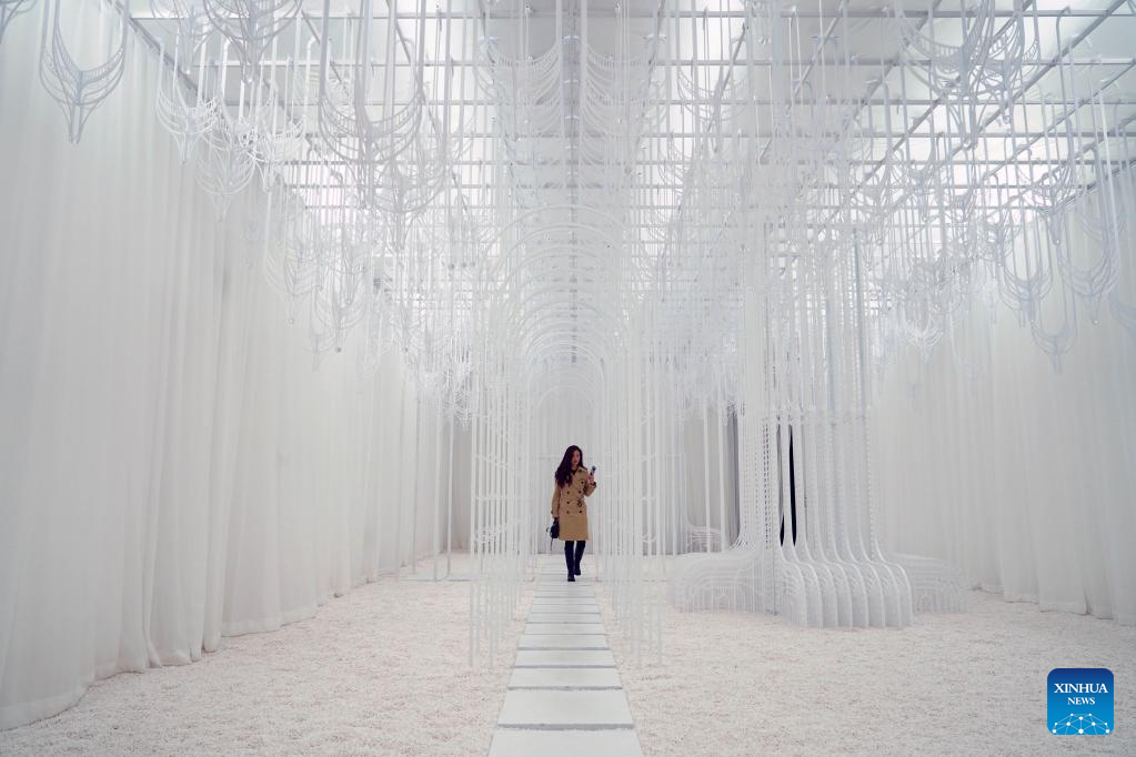 A tourist visits the contemporary art exhibition "WAVELENGTH: A Momentary Spring" at Beijing Times Art Museum in Beijing, capital of China, March 29, 2023. The event kicked off here on Wednesday, displaying contemporary art installations from 16 international artists. It will last until July 1. (Xinhua/Ren Chao)