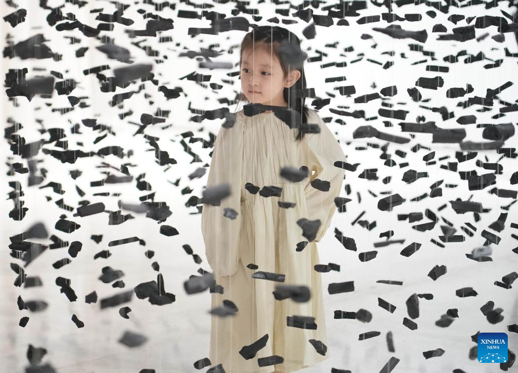 A child visits the contemporary art exhibition "WAVELENGTH: A Momentary Spring" at Beijing Times Art Museum in Beijing, capital of China, March 29, 2023. The event kicked off here on Wednesday, displaying contemporary art installations from 16 international artists. It will last until July 1. (Xinhua/Ren Chao)