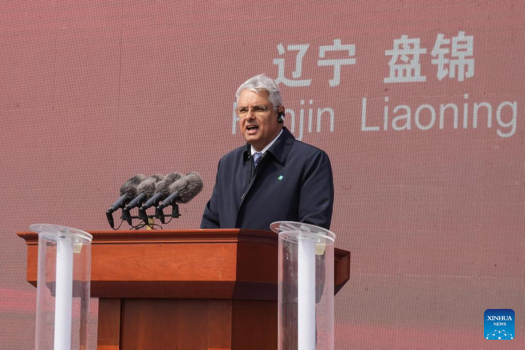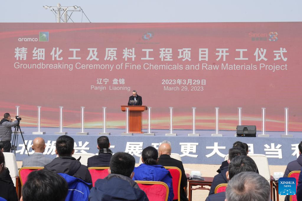 This photo taken on March 29, 2023 shows the groundbreaking ceremony of a major chemical project, a joint investment initiative by China and Saudi Arabia, in Panjin City of northeast China's Liaoning Province. (Xinhua/Pan Yulong)