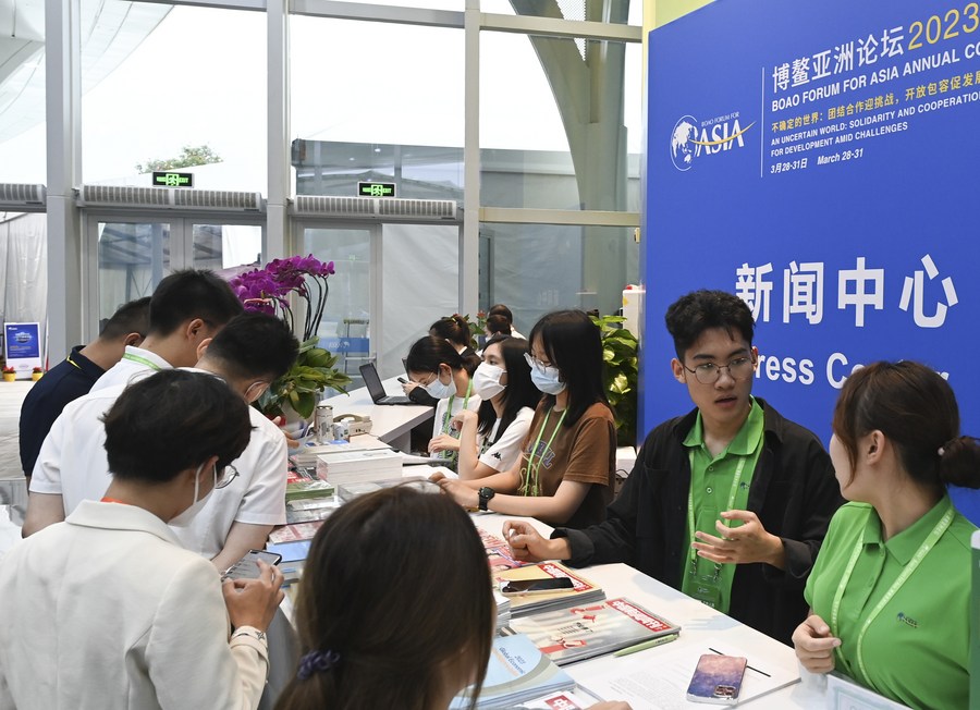 Staff members work at the press center of the Boao Forum for Asia (BFA) Annual Conference 2023 in Boao, south China's Hainan Province, March 27, 2023. (Xinhua/Yang Guanyu)