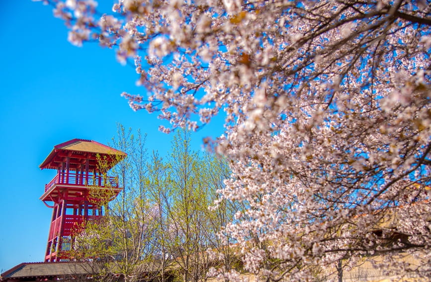 Photo shows blooming flowers in Yinxu National Archaeological Site Park in Anyang city, central China’s Henan Province. (Photo/Peng Jie)