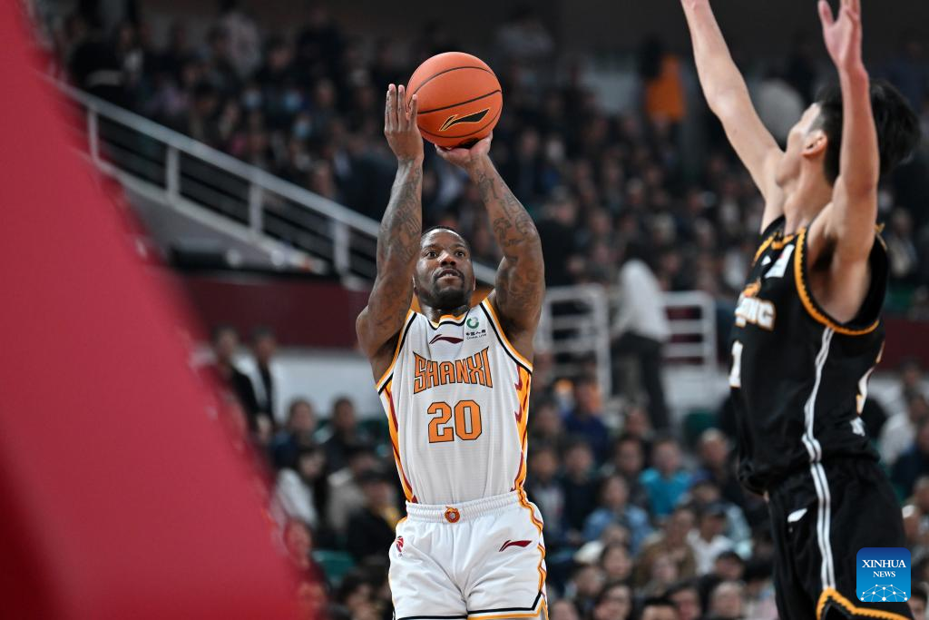 Kay Felder (L) of Shanxi Loongs shoots during the 40th round match between Shanxi Loongs and Liaoning Flying Leopards at 2022-2023 season of the Chinese Basketball Association (CBA) league in Taiyuan, capital of north China's Shanxi Province, March 30, 2023. (Xinhua/Zhan Yan)