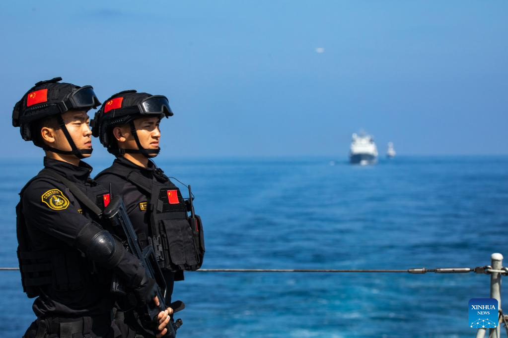 Soldiers of the 42nd fleet of the Chinese People's Liberation Army Navy stand guard during sailing, on Feb. 8, 2023. A Chinese naval fleet returned to east China's port city of Qingdao in Shandong Province on Thursday after completing its mission of escorting civilian vessels in the Gulf of Aden and in the waters off Somalia. (Photo by Wang Qing/Xinhua)