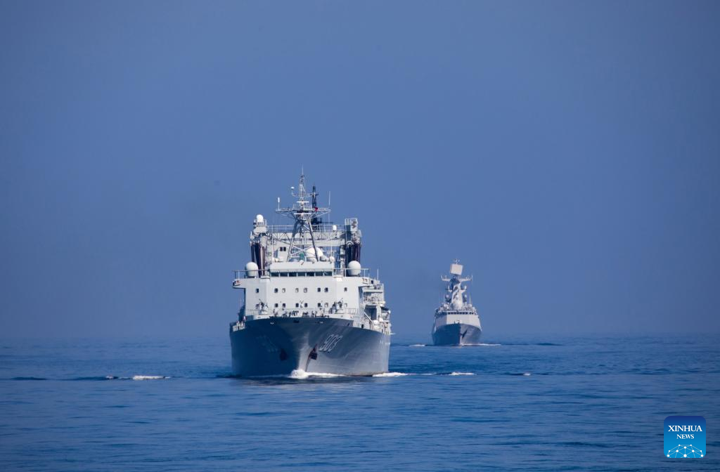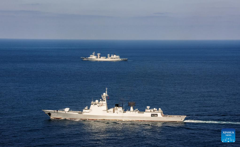 The missile destroyer Huainan (down) and the supply ship Hoh Xil (up) of the 42nd fleet of the Chinese People's Liberation Army Navy sail on the sea, on Feb. 3, 2023. A Chinese naval fleet returned to east China's port city of Qingdao in Shandong Province on Thursday after completing its mission of escorting civilian vessels in the Gulf of Aden and in the waters off Somalia. (Photo by Ma Yubin/Xinhua)