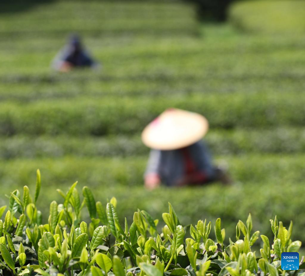 Growers pick tea leaves at a tea garden in Tiankan Village of Nanlong Township, Kaiyang County in Guiyang City, southwest China's Guizhou Province, April 4, 2023. Around the time of Qingming Festival which falls on April 5 this year, farmers across the country are busy with farm work.(Xinhua/Yuan Fuhong)