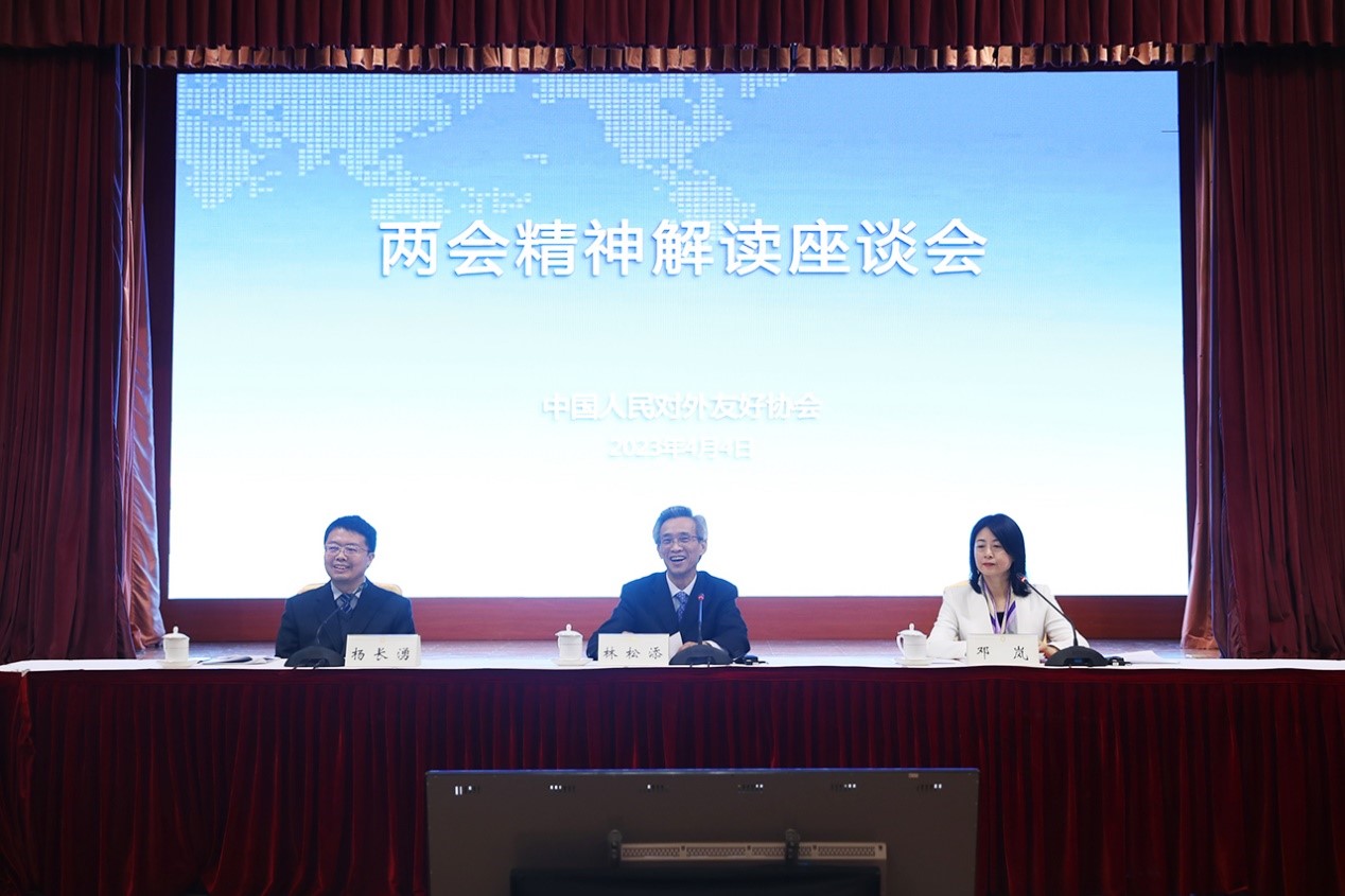 Photo shows Lin Songtian (center), President of the Chinese People's Association for Friendship with Foreign Countries (CPAFFC), delivering a speech at the forum explaining the guiding principles set out at the 2023 Two Sessions, held by the CPAFFC, on April 4, 2023. (People’s Daily Online/Cai Hairuo)