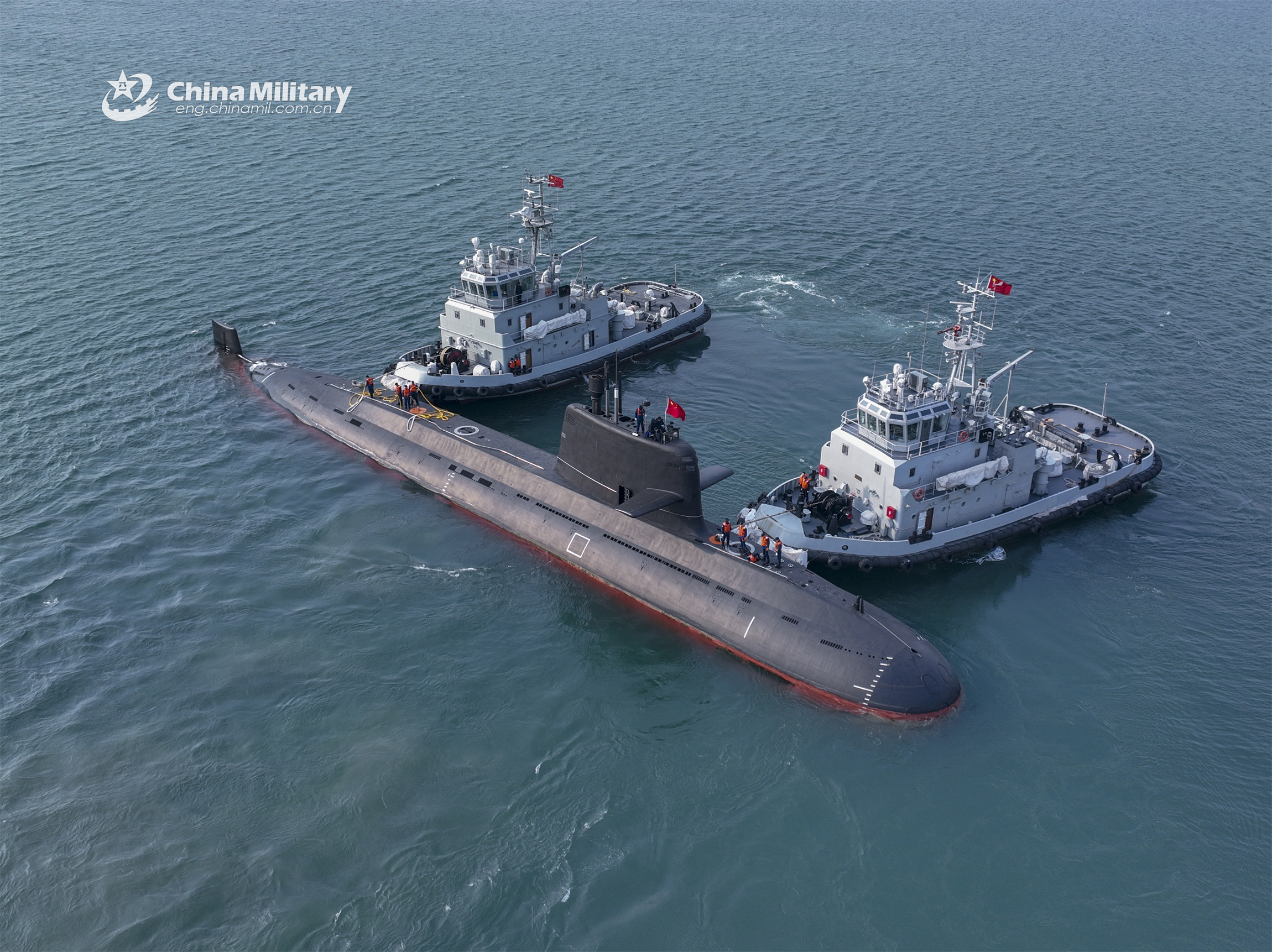 Two towboats attached to a naval submarine flotilla under the PLA Northern Theater Command tow a submarine to bear off a port during a training exercise on March 21, 2023. (eng.chinamil.com.cn/Photo by Wu Haodong)