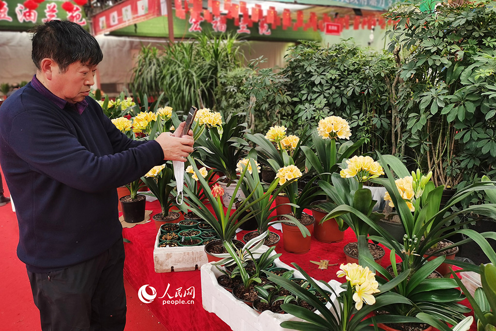 A citizen takes pictures of bush lilies at a kaffir lily festival held in Changchun city, capital of northeast China's Jilin Province, March 27, 2023. (People's Daily Online/Wang Diyuan)