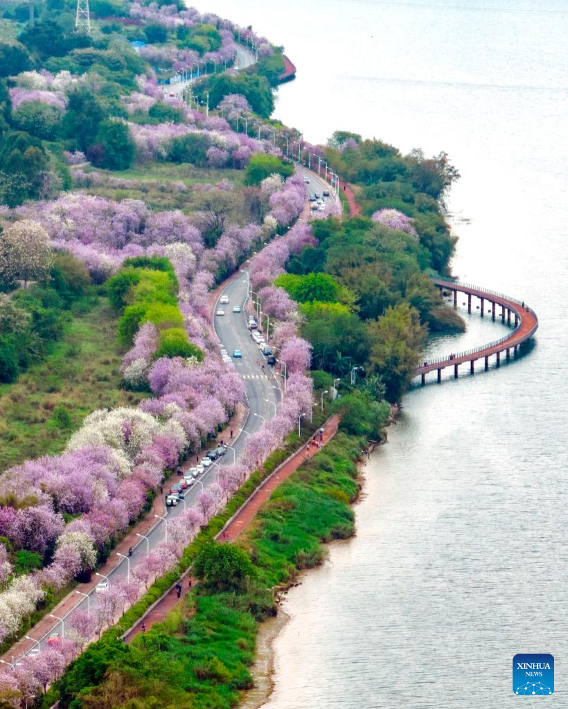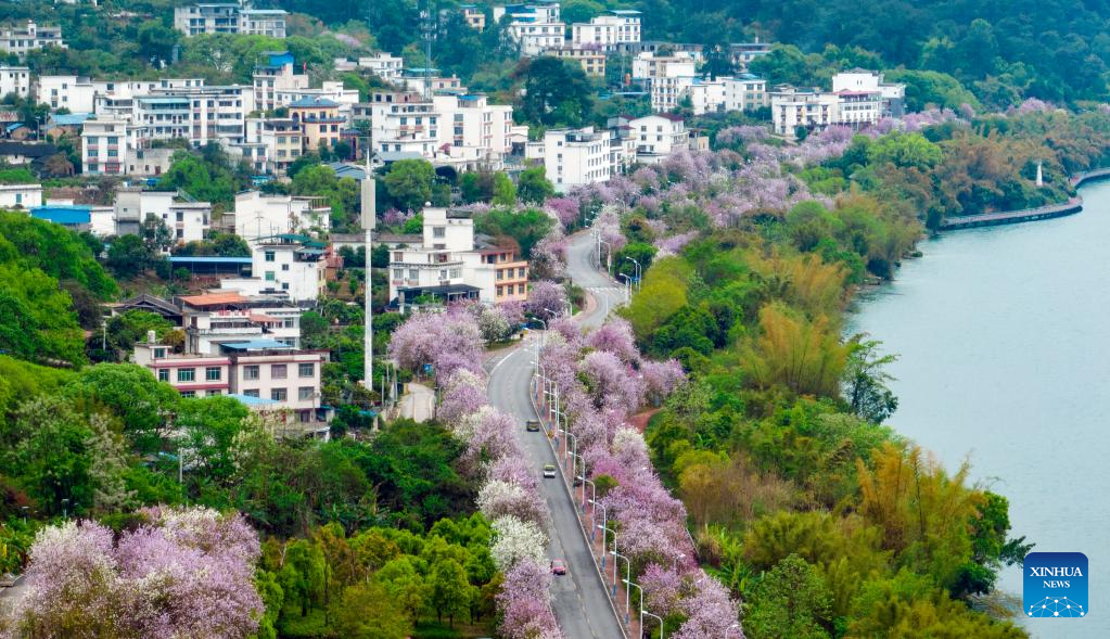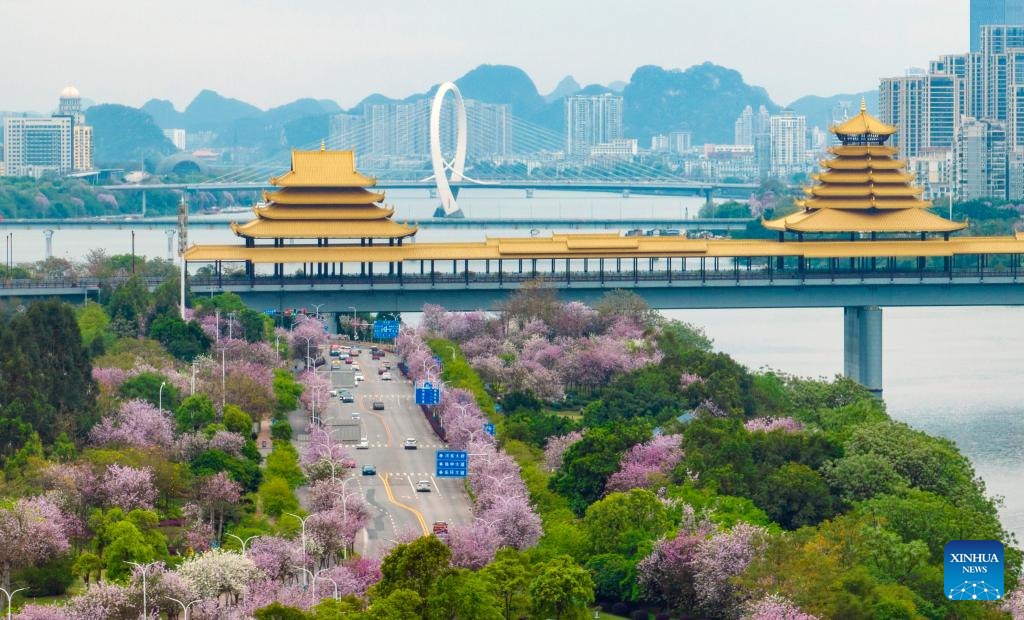 This aerial photo taken on April 5, 2023 shows cars running past Bauhinia blossoms in Liuzhou City, south China's Guangxi Zhuang Autonomous Region. (Photo by Li Hanchi/Xinhua)
