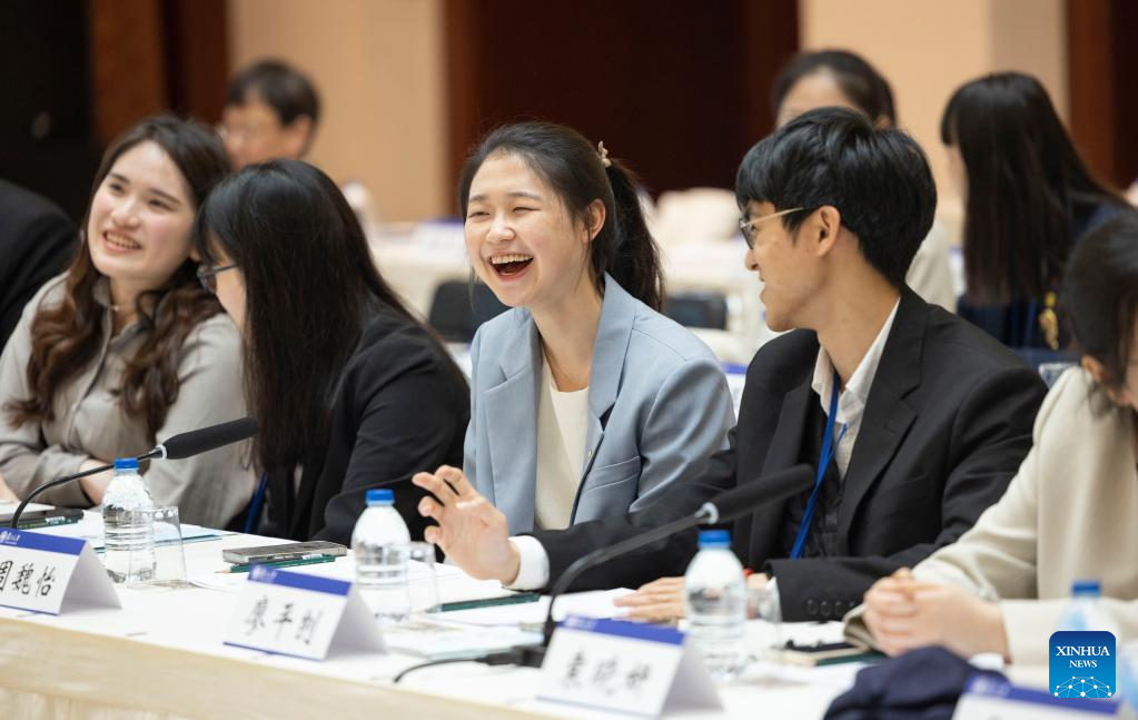 Taiwan students and students of Fudan University attend a group discussion at Fudan University in east China's Shanghai, April 6, 2023. Ma Ying-jeou, former chairman of the Chinese Kuomintang party, led a group of Taiwan students to Fudan University in Shanghai on Thursday morning. (Xinhua/Cai Yang)