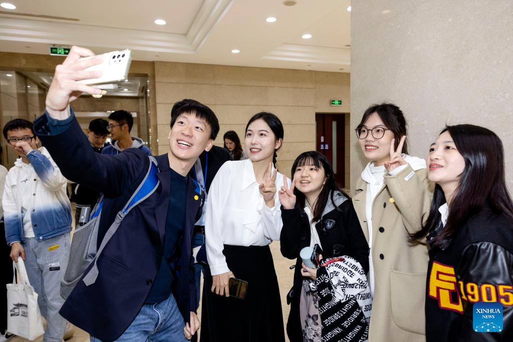 Taiwan students and students of Fudan University take a selfie after a group discussion at Fudan University in east China's Shanghai, April 6, 2023. Ma Ying-jeou, former chairman of the Chinese Kuomintang party, led a group of Taiwan students to Fudan University in Shanghai on Thursday morning. (Xinhua/Cai Yang)