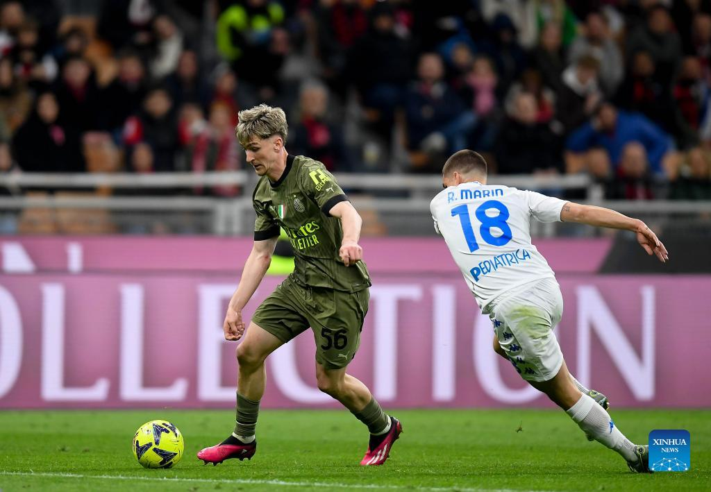 AC Milan's Theo Hernandez (R) vies with Empoli's Jacopo Fazzini during a Serie A football match between AC Milan and Empoli in Milan, Italy, on April 7, 2023. (Photo by Daniele Mascolo/Xinhua)