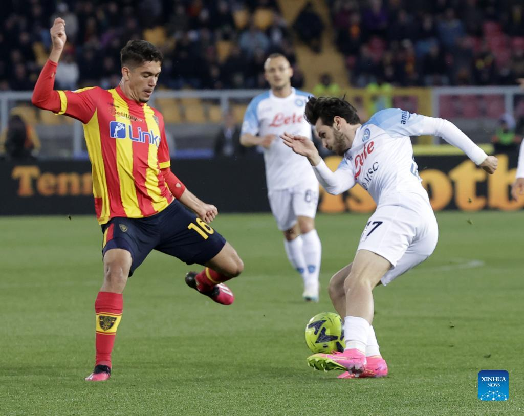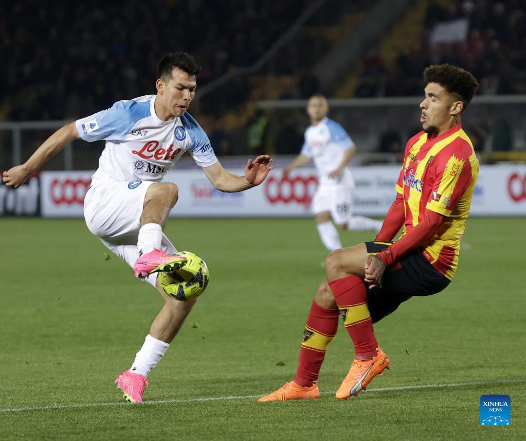 Napoli's Hirving Lozano (L) vies with Lecce's Valentin Gendrey during a Serie A football match between Napoli and Lecce in Lecce, Italy, on April 7, 2023. (Str/Xinhua)