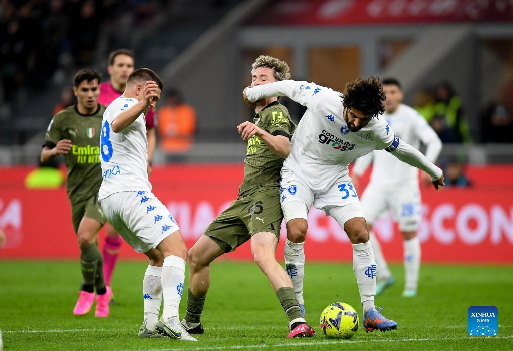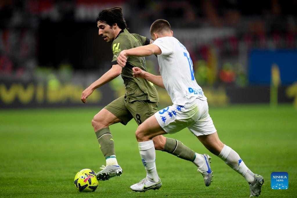AC Milan's Sandro Tonali (L) vies with Empoli's Razvan Marin during a Serie A football match between AC Milan and Empoli in Milan, Italy, on April 7, 2023. (Photo by Daniele Mascolo/Xinhua)