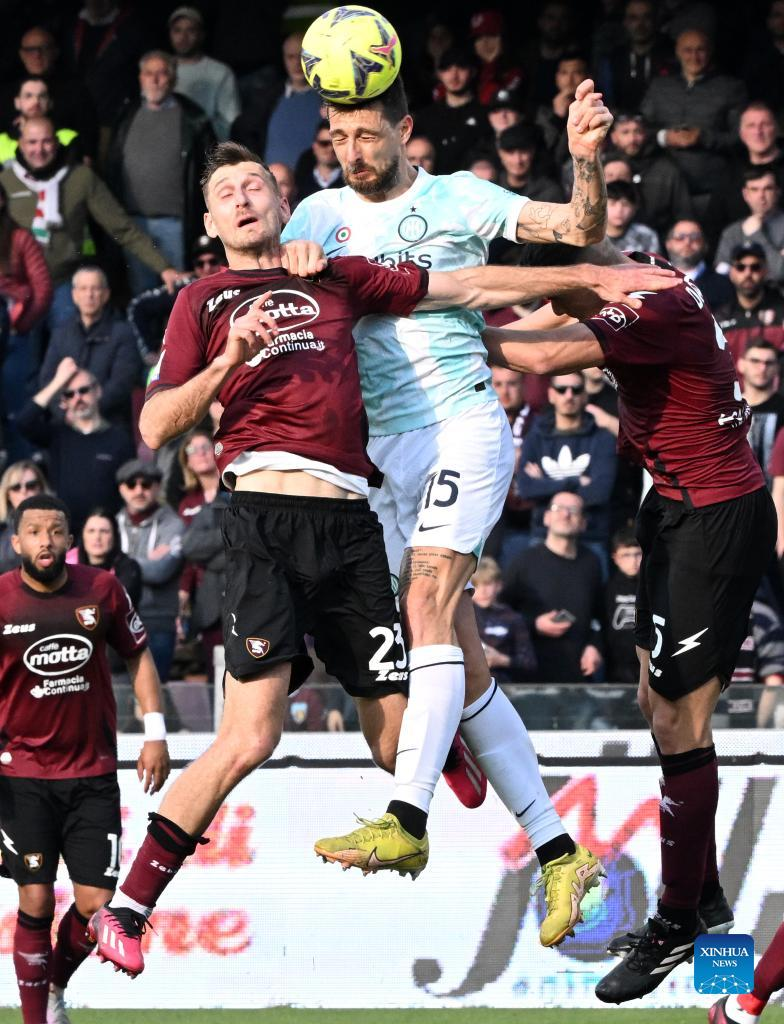 ROME, April 7 (Xinhua) -- Inter Milan's long-awaited victory was ruined by Antonio Candreva as the ex-Inter player's stunner in the dying minutes helped Salernitana draw the Nerazzurri 1-1 in Serie A on Friday.