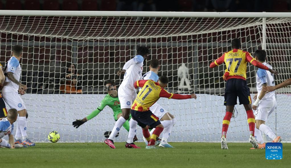 Lecce's Federico Di Francesco scores his goal during a Serie A football match between Napoli and Lecce in Lecce, Italy, on April 7, 2023. (Str/Xinhua)