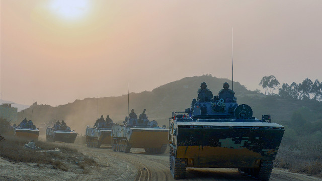Armored vehicles attached to a brigade of the PLA Navy Marine Corps maneuver in formation after a live-fire assessment in early March, 2023. (eng.chinamil.com.cn/Photo by Gao Guojing)