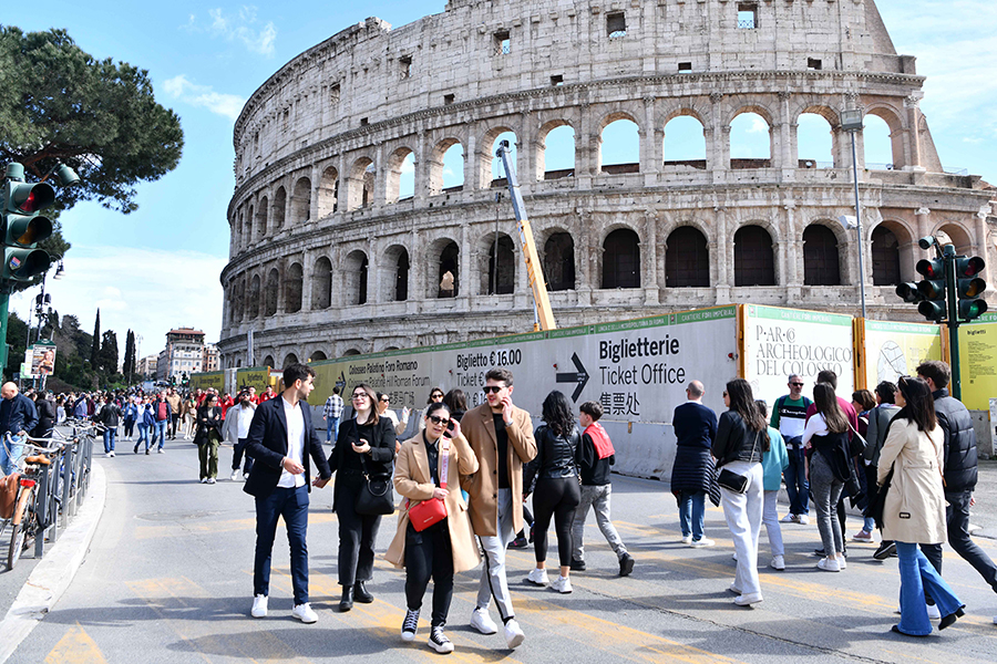 Tourists walk past signs in Italian, English and Chinese at the Colosseum in Rome, Italy, on March 26. [PHOTO by JIN MAMENGNI/XINHUA]