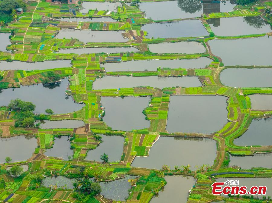 Rows of green vegetable fields in a fish pond form a picturesque rural scene on Changzhou Island in Wuzhou, south China's Guangxi Zhuang Autonomous Region, April 8, 2023. (Photo: China News Service/He Wenhua)