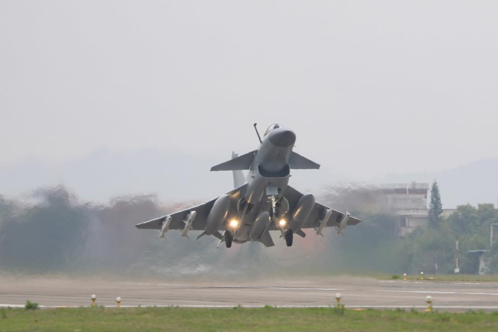 This photo taken on April 8, 2023 shows a fighter taking off during the combat readiness patrol and military exercises around the Taiwan Island carried out by the Eastern Theater Command of the Chinese People's Liberation Army (PLA). (Photo by Wang Zixiao/Xinhua)
