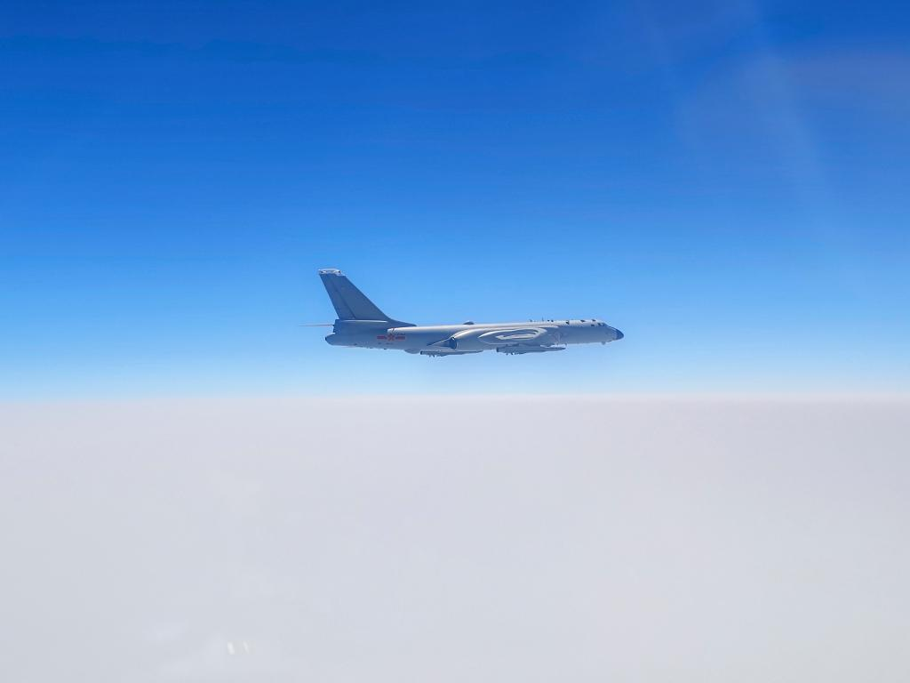 This video screenshot taken on April 8, 2023 shows a bomber of the Eastern Theater Command of the Chinese People's Liberation Army (PLA) conducting operations during the combat readiness patrol and military exercises around the Taiwan Island. (Photo by Yang Yang/Xinhua)