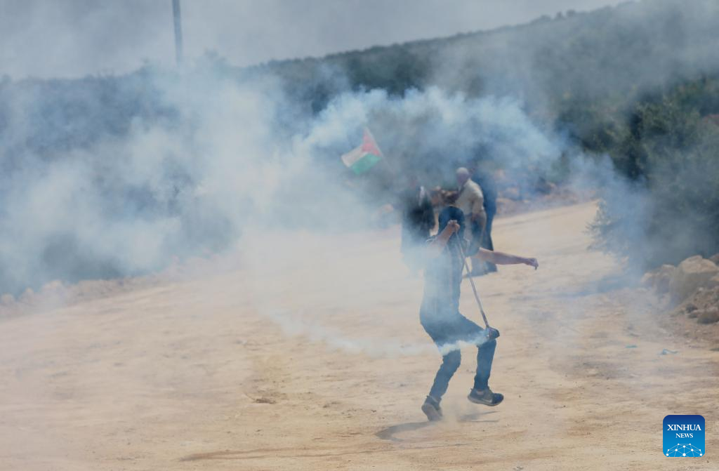 A Palestinian protester throws back a tear gas canister fired by Israeli soldiers during clashes following a protest against Israeli march to the nearby Israeli outpost of Eviatar, in the West Bank city of Nablus, on April 10, 2023. (Photo by Ayman Nobani/Xinhua)