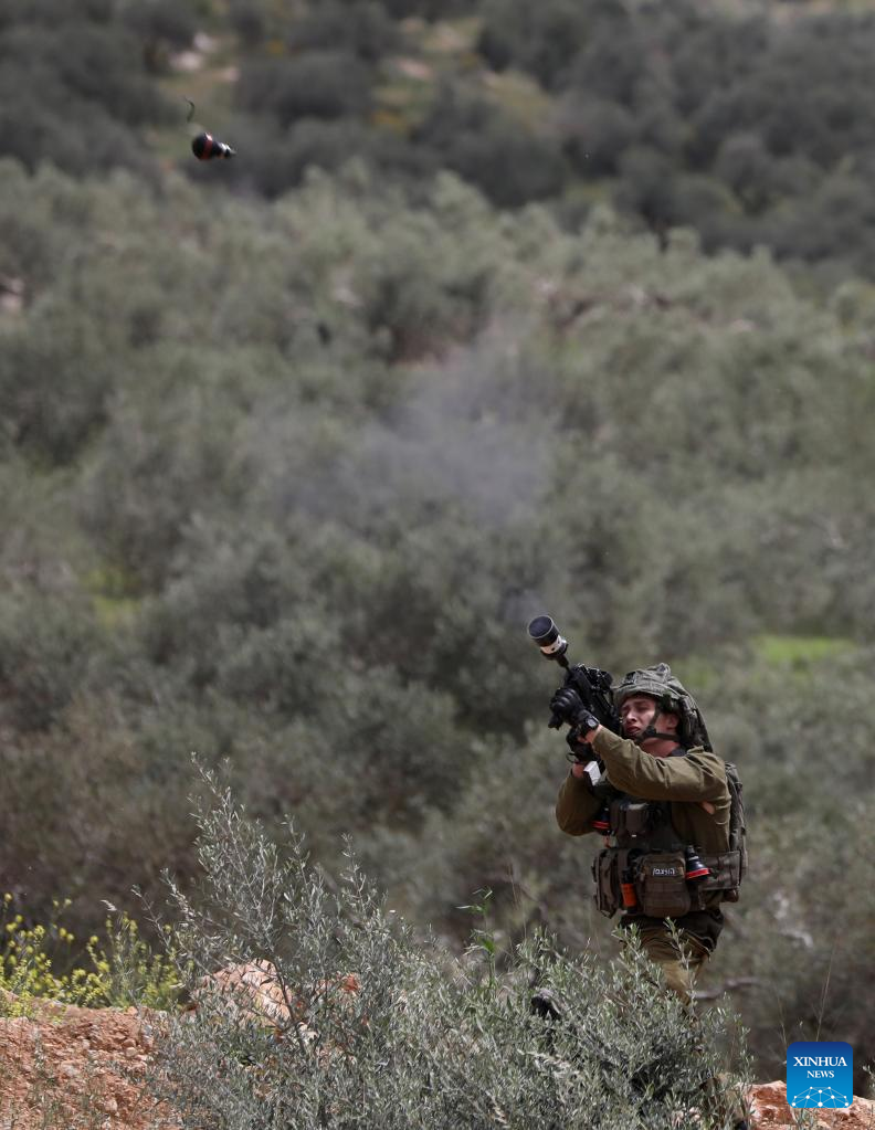 An Israeli soldier fires a tear gas canister at Palestinian protesters during clashes following a protest against Israeli march to the nearby Israeli outpost of Eviatar, in the West Bank city of Nablus, on April 10, 2023. (Photo by Ayman Nobani/Xinhua)
