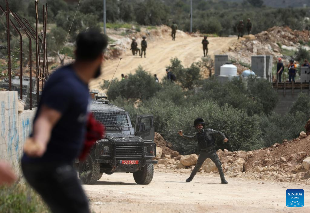 An Israeli soldier throws a tear gas canister at Palestinian protesters during clashes following a protest against Israeli march to the nearby Israeli outpost of Eviatar, in the West Bank city of Nablus, on April 10, 2023. (Photo by Ayman Nobani/Xinhua)