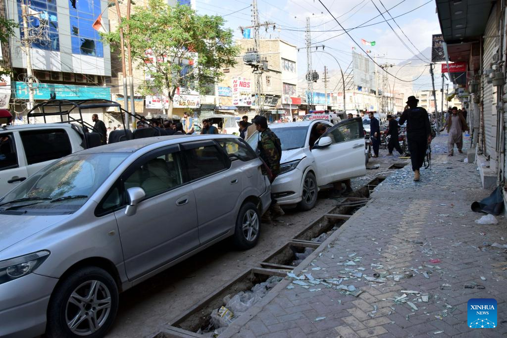 This photo taken on April 10, 2023 shows the blast site in Quetta, the provincial capital of Pakistan's southwest Balochistan province. At least four people, including two policemen, were killed and 15 others injured in a blast on Monday in Quetta, police and health officials said. (Str/Xinhua)