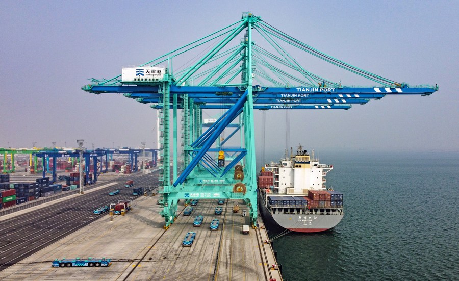Aerial photo taken on April 9, 2022 shows a container ship by the Beijiang Port Area of Tianjin Port in north China's Tianjin Municipality. (Xinhua/Zhao Zishuo)