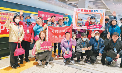 Tourists pose for a group photo before boarding the tourist train Y61 at the Beijing Fengtai Railway Station in Beijing. (Photo/Li Rui)