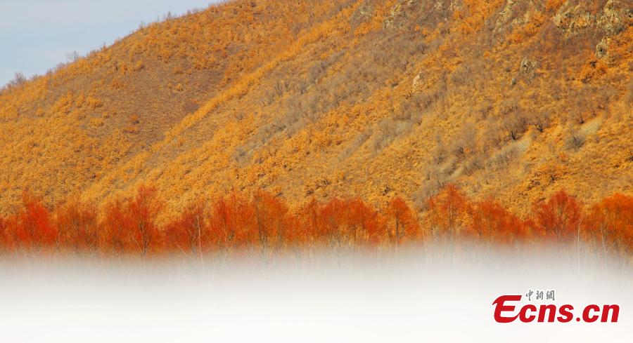 Red willows flourish on the banks of the Nuomin River with the arrival of spring in north China’s Inner Mongolia Autonomous Region. The red willows and the half-frozen river present a beautiful scene in April. (Photo: China News Service/Jiang Xiwu)