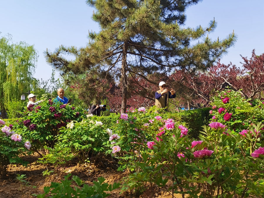 A tourist takes photos of blossoming peony flowers at the National Peony Garden in Luoyang, central China's Henan Province, April 10, 2023. (People’s Daily Online/Du Mingming)