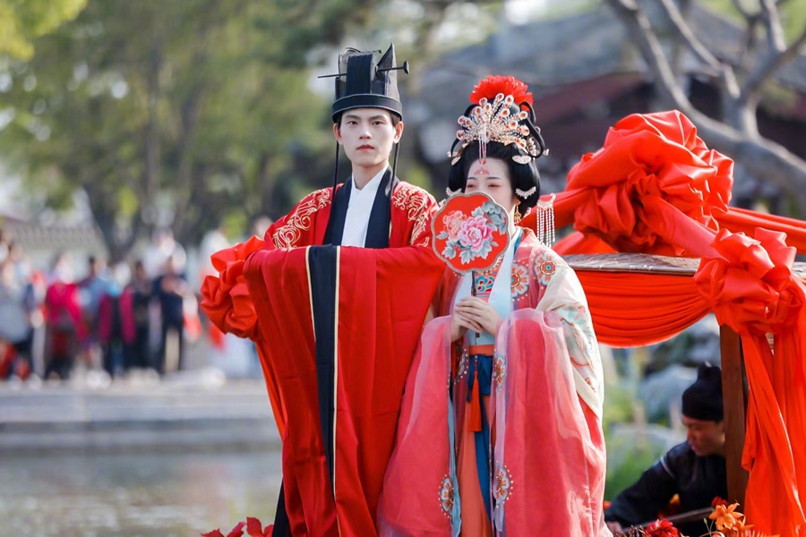 Photo shows a Hanfu show at the Jiuzhou Pond Scenic Area in Luoyang city, central China's Henan Province. (Photo courtesy of Jiuzhou Pond Scenic Area)