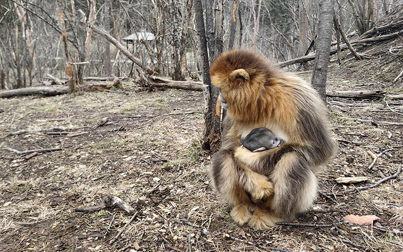 A female golden snub-nosed monkey holds her newborn cub in her arms. (Photo/Huang Tianpeng)