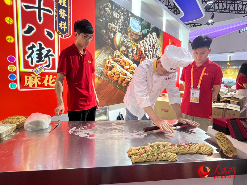 A craftsman makes Mahua, or fried dough twists, a national-level intangible cultural heritage in China, during the ongoing third China International Consumer Products Expo (CICPE) in Haikou, capital city of south China's Hainan Province. (People's Daily Online/Du Yanfei)