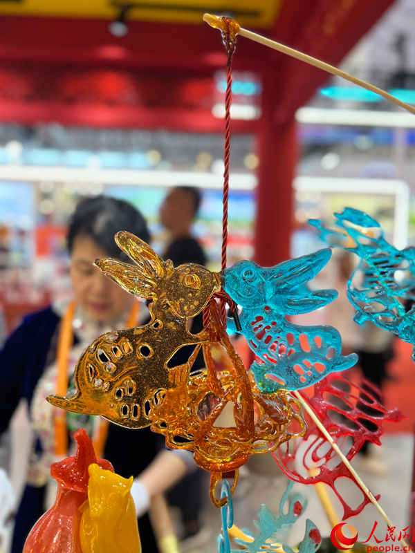 Sugar sculptures made by the Li family, an intangible cultural heritage in northeast China's Liaoning Province, are displayed at the ongoing third China International Consumer Products Expo (CICPE) in Haikou, capital city of south China's Hainan Province. (People's Daily Online/Du Yanfei)