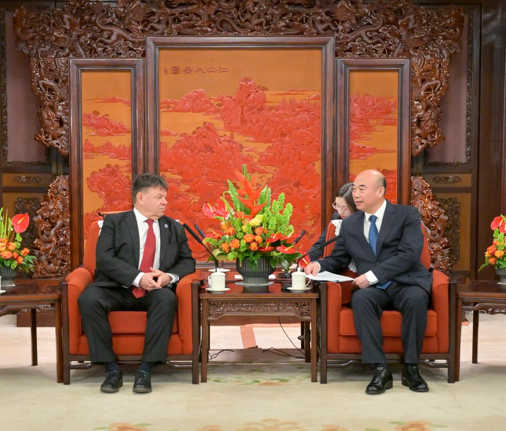 Chinese Vice Premier Liu Guozhong meets with Petteri Taalas, secretary-general of the World Meteorological Organization (WMO), in Beijing, capital of China, April 12, 2023. (Xinhua/Gao Jie)