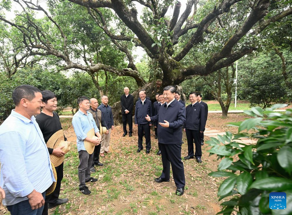 Chinese President Xi Jinping, also general secretary of the Communist Party of China Central Committee and chairman of the Central Military Commission, talks with villagers at a village in Genzi Township, Gaozhou City of Maoming, south China's Guangdong Province, April 11, 2023. Xi visited a lychee orchard and a longan and lychee cooperative at the village to learn about local efforts to develop distinctive planting industry and advance rural revitalization. (Xinhua/Liu Bin)