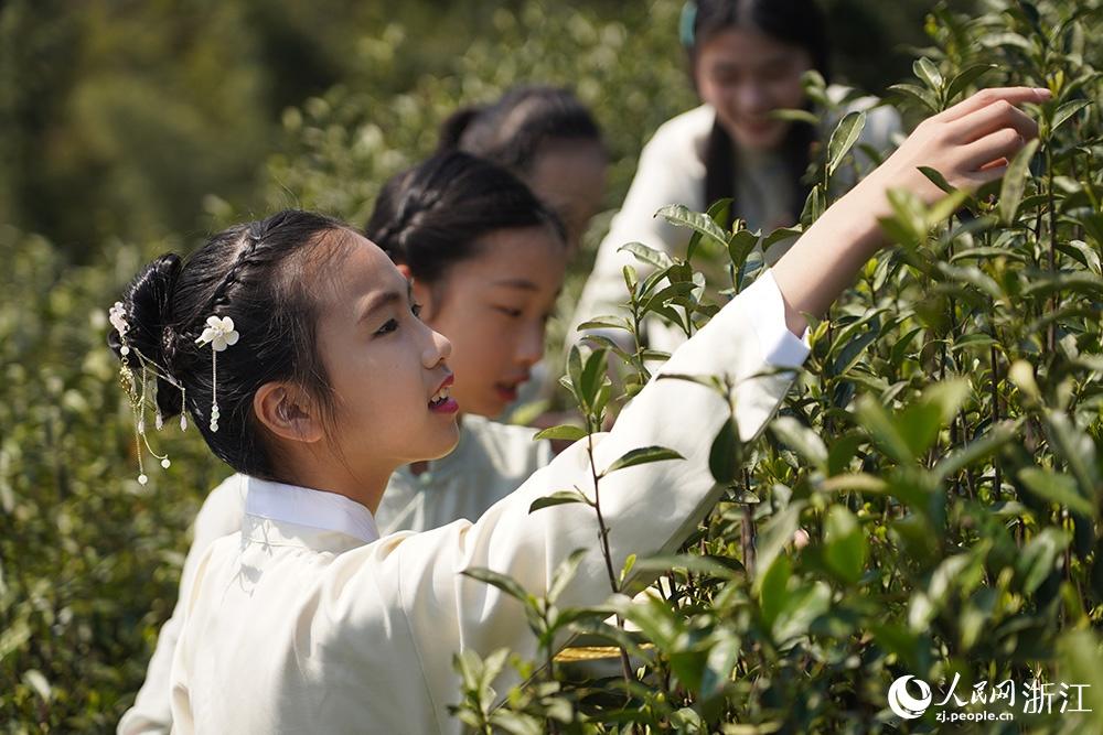 Children pick spring tea leaves at a tea garden in Kuangyan town, Cixi, east China's Zhejiang Province. (People's Daily Online/Zhang Yongtao)