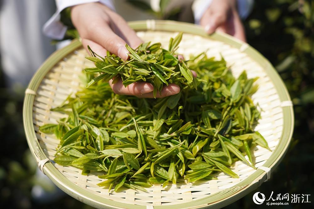 Photo shows harvested spring tea leaves at a tea garden in Kuangyan town, Cixi, east China's Zhejiang Province. (People's Daily Online/Zhang Yongtao)