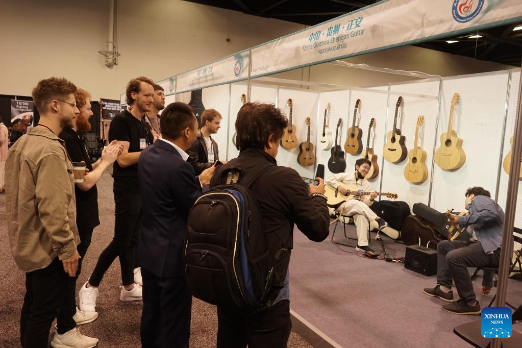 Convention goers visit the exhibition area of Chinese companies from Zheng'an county in southwest China's Guizhou province during the 2023 National Association of Music Merchants (NAMM) show at Anaheim Convention Center in Anaheim, California, the United States, on April 13, 2023. China-made musical instruments are taking the limelight at an ongoing music industry exhibition in Southern California, attracting lots of attention and recognition from overseas customers and distributors. (Photo by Zeng Hui/Xinhua)