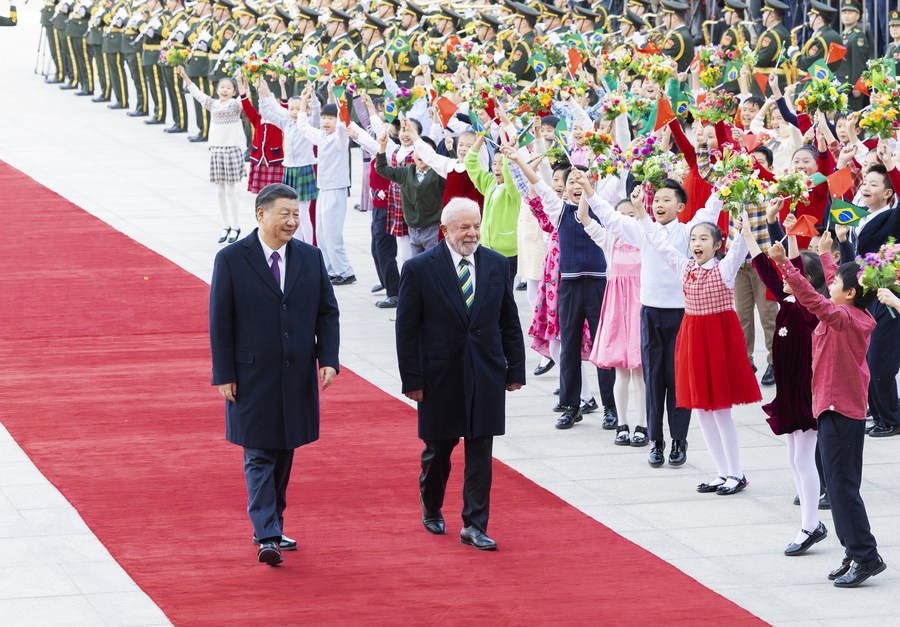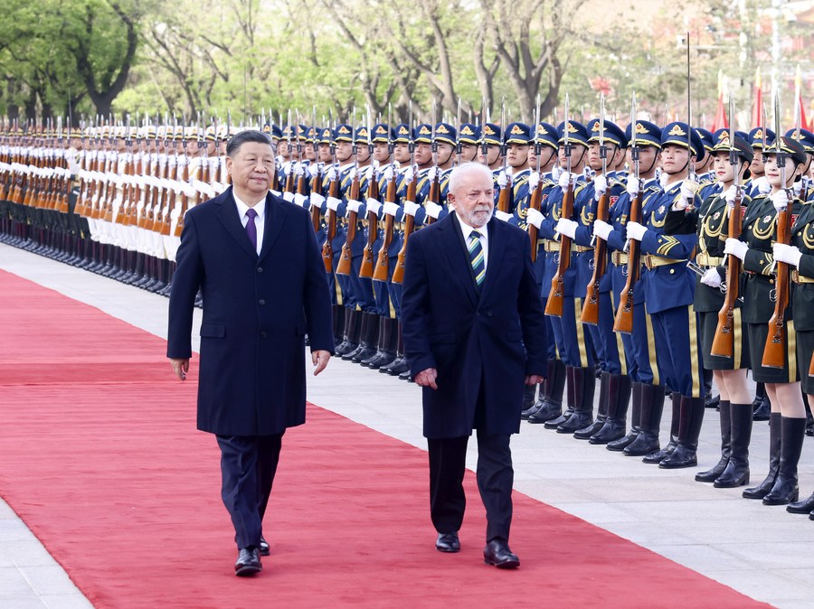 Chinese President Xi Jinping holds a welcoming ceremony for Brazilian President Luiz Inacio Lula da Silva at the square outside the east entrance of the Great Hall of the People prior to their talks in Beijing, capital of China, April 14, 2023. Xi held talks with Lula, who is on a state visit to China, in Beijing on Friday. (Xinhua/Huang Jingwen)