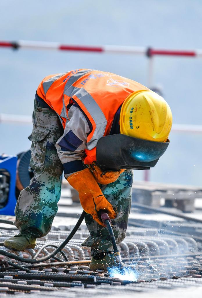 A welder works at the construction site of the Wujiang grand bridge on the expressway linking Dejiang and Yuqing in southwest China's Guizhou Province, April 11, 2023. (Xinhua/Yang Wenbin)