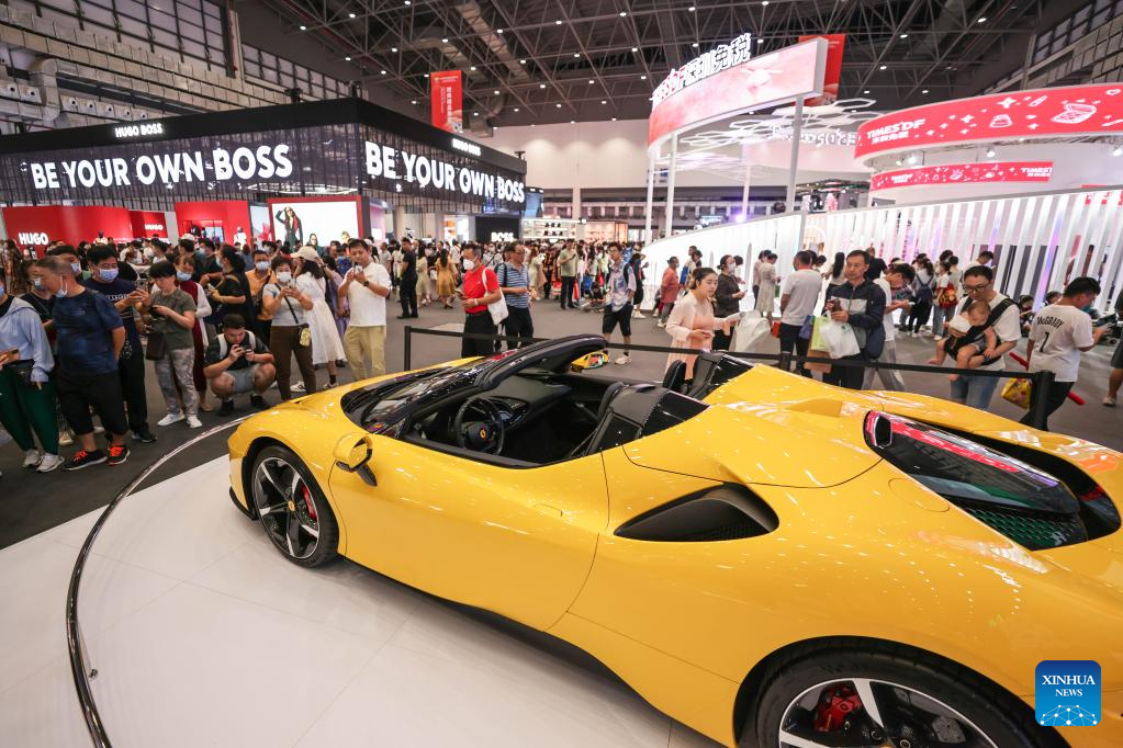 Visitors take a look at the booth of Bentley at the third China International Consumer Products Expo (CICPE) in Haikou, capital city of south China's Hainan Province, on April 14, 2023. The expo opened to the public on Friday. (Xinhua/Li Xin)