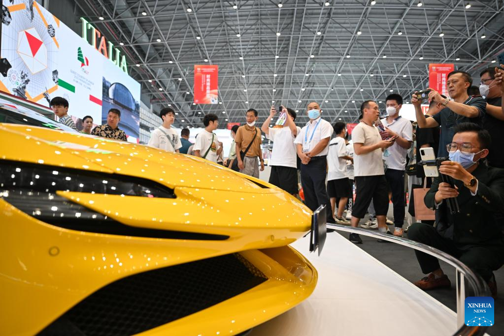 Visitors watch exhibits at the booth of Italy at the third China International Consumer Products Expo (CICPE) in Haikou, capital city of south China's Hainan Province, on April 14, 2023. The expo opened to the public on Friday. (Xinhua/Wang Zecong)