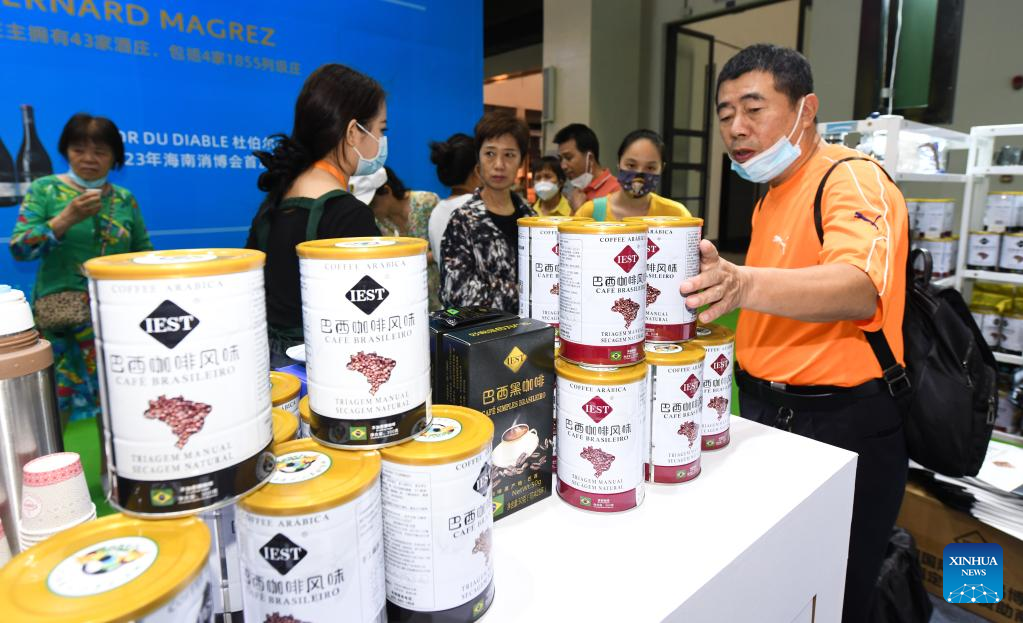 Visitors learn about Brazilian coffee at the third China International Consumer Products Expo (CICPE) in Haikou, capital city of south China's Hainan Province, on April 14, 2023. The expo opened to the public on Friday. (Xinhua/Yang Guanyu)