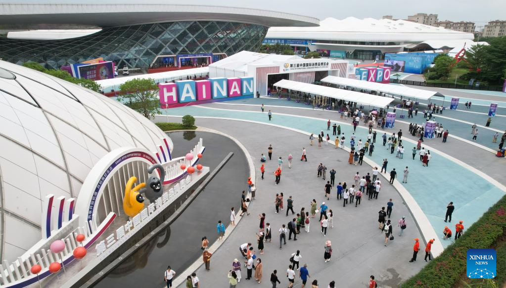 Visitors walk into the exhibition hall of the third China International Consumer Products Expo (CICPE) in Haikou, capital city of south China's Hainan Province, on April 14, 2023. The expo opened to the public on Friday. (Xinhua/Li Xin)