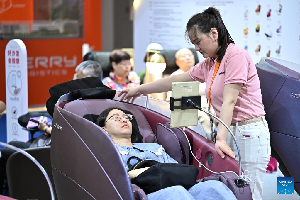 Visitors experience massage sofas during the third China International Consumer Products Expo (CICPE) in Haikou, capital city of south China's Hainan Province, on April 14, 2023. The expo opened to the public on Friday. (Xinhua/Li Xin)